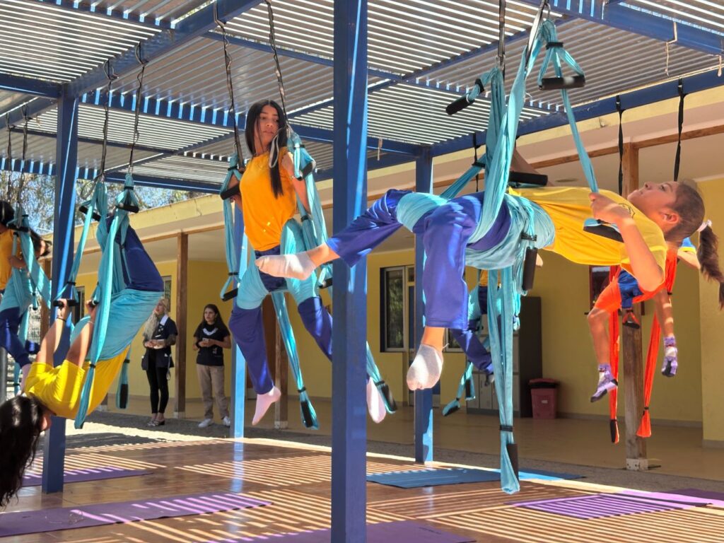 Por su parte, la estudiante Isabella González de sexto básico practica aeroyoga desde hace casi 2 años, relatando que le entrega disciplina y relajación. De los beneficios afirma que “hacemos aeroyoga y las posturas que nos enseña la profe Pili es terapia. Nos sentimos relajados y tenemos confianza con la tela”.